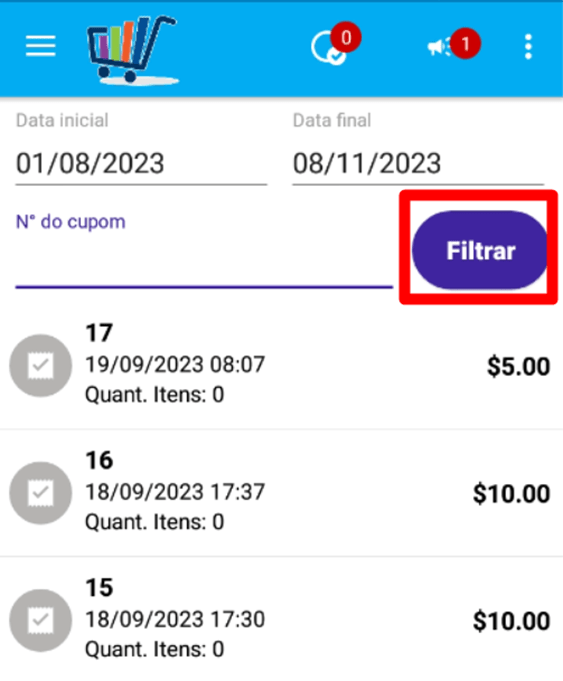 3. Ao acessar o menu ‘Histórico’, é possível utilizar o filtro de data inicial e final ou o número do cupom para localizar o pedido que deseja cancelar. Após aplicar um dos filtros, clique em ‘Filtrar’ para realizar a busca: