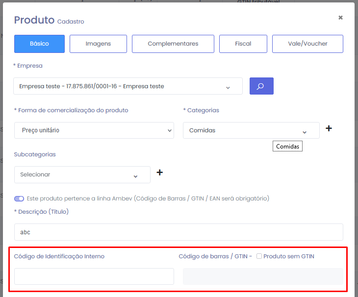 OBSERVAÇÃO: Pode-se salvar o produto duplicado sem informar os campos Código de Identificação Interno, Código de Barras / GTIN e Código de Barras / GTIN Tributável caso o produto não esteja marcado como Produto Pertencente à linha Ambev.