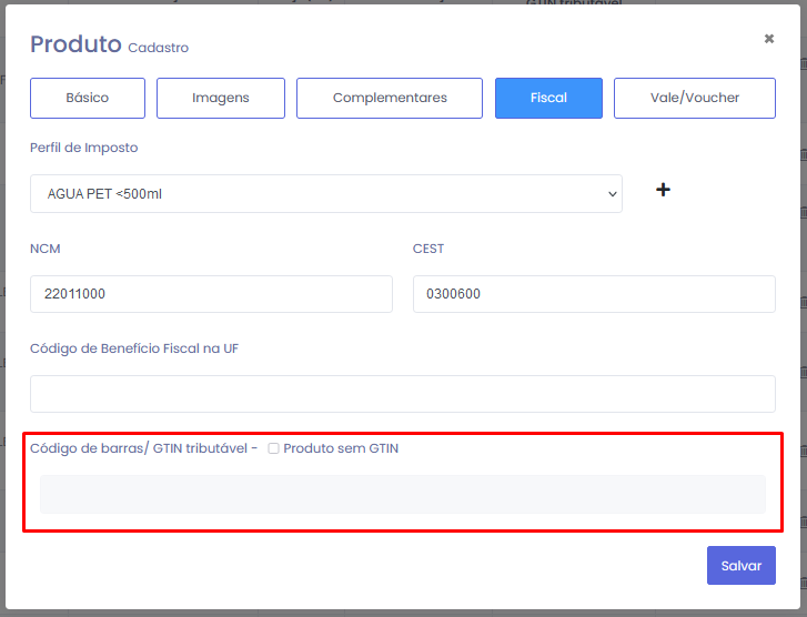 Irá abrir a tela igual a de editar/novo Produto com o Código de Identificação Interno, Código de Barras / GTIN e Código de Barras / GTIN Tributável na aba Fiscal vazios, pois será preciso informar esses dados;
