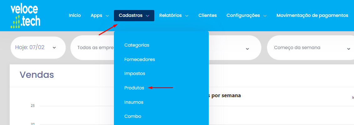 Acesse o Painel WEB com seus dados de login acesse o menu Cadastros -> Produtos;