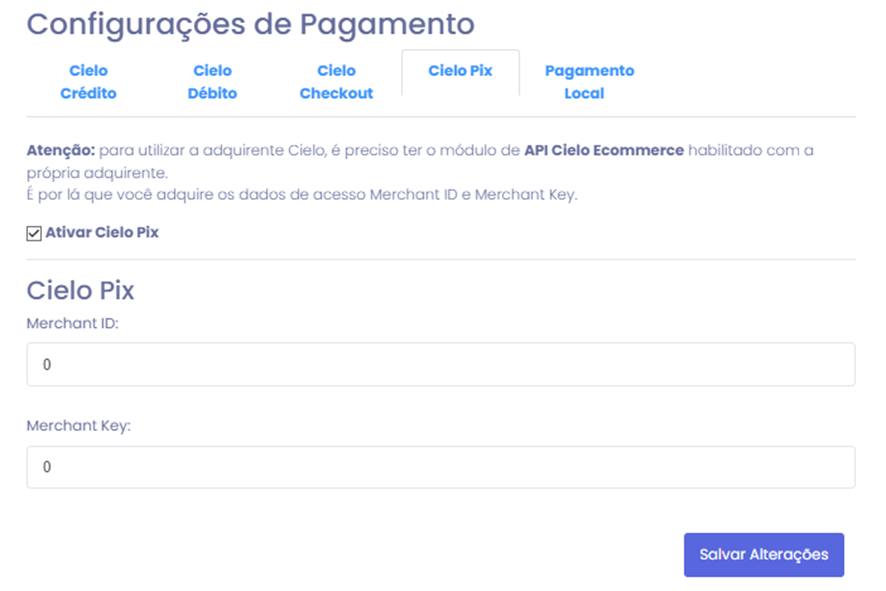 Nota importante: Para obter o ‘Merchant ID’ e o ‘Merchant Key’ é preciso ter o módulo de API Cielo E-Commerce habilitado com a própria adquirente.
