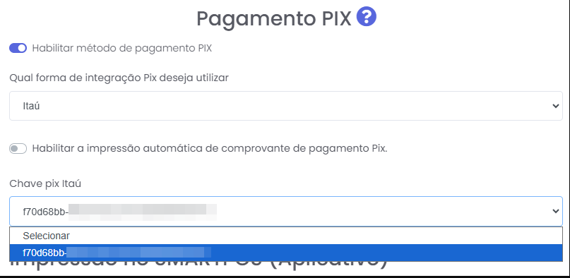 Selecione a opção de integração Itaú e escolha a chave PIX Itaú que deseja utilizar.
