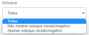 Dentro deste relatório você terá o filtro “Estoque”, onde poderá ocultar os produtos com estoque zerado e negativo: