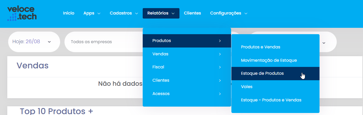 Primeiramente será necessário acessar o relatório de estoque de produtos.