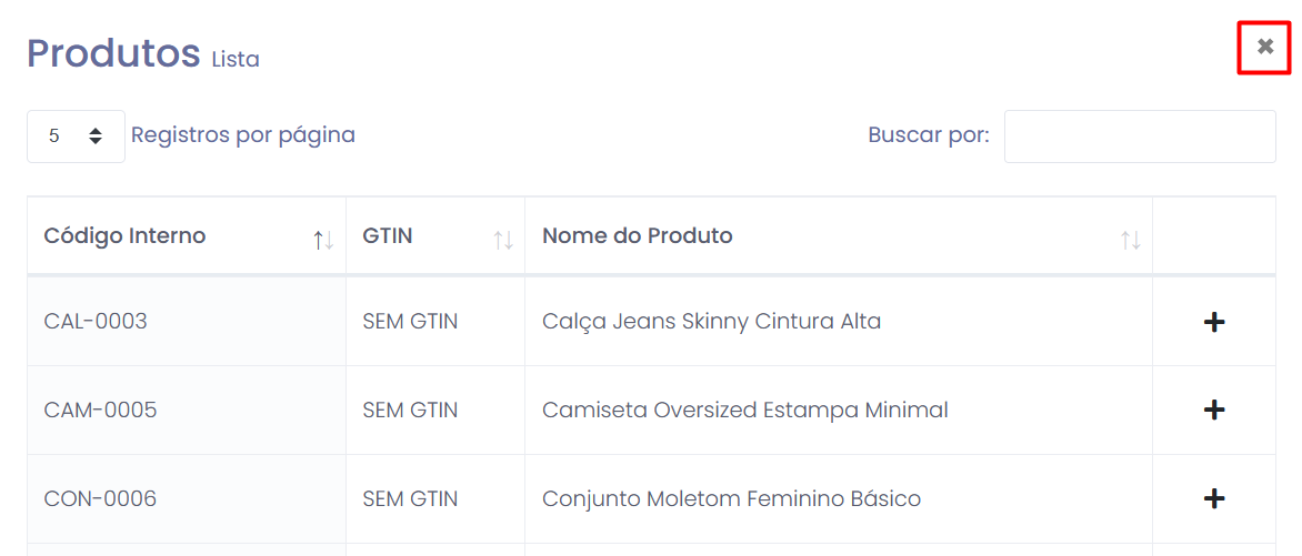 • Após adicionar os produtos, clique no X no canto superior direito para fechar a tela