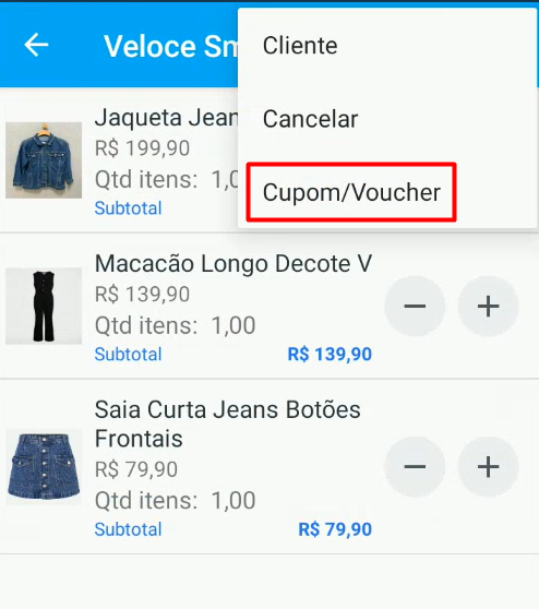 1. No carrinho, clique nos 3 pontinhos no canto superior direito e selecione Cupom/Voucher.