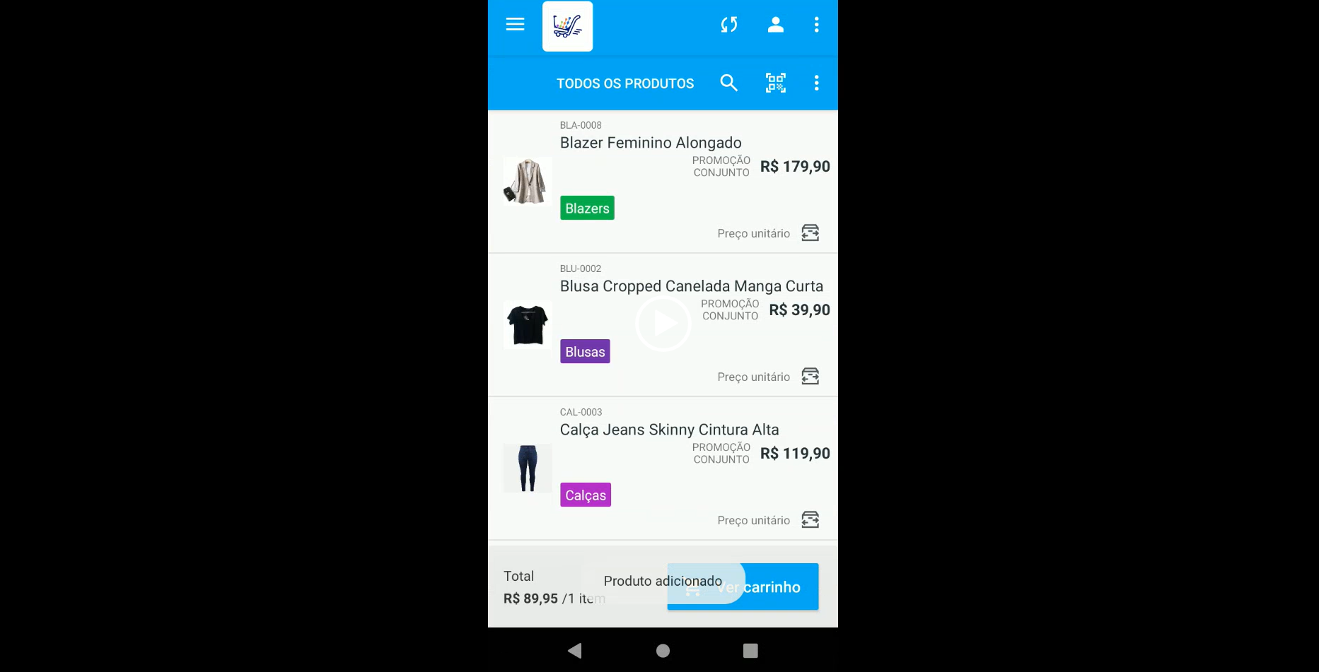 Em seguida, aponte a câmera para o código de barras do produto. Após a leitura, o item será automaticamente adicionado ao carrinho.