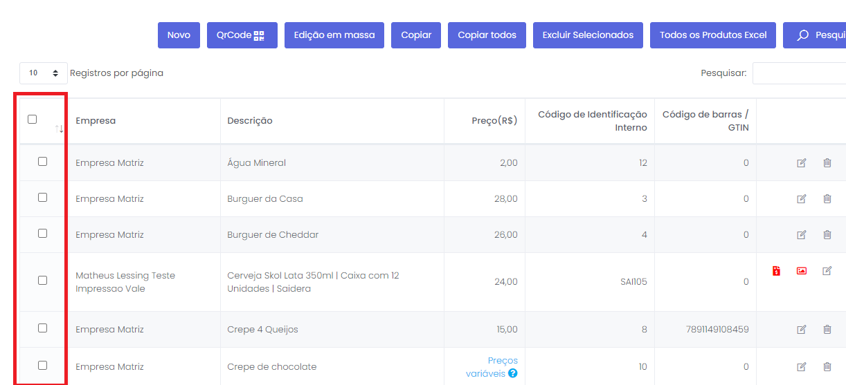 2. Copiar produtos específicos: No canto esquerdo da lista de produtos, há uma caixa designada para cada produto. Selecione as caixas dos produtos que você deseja copiar, como abaixo:
