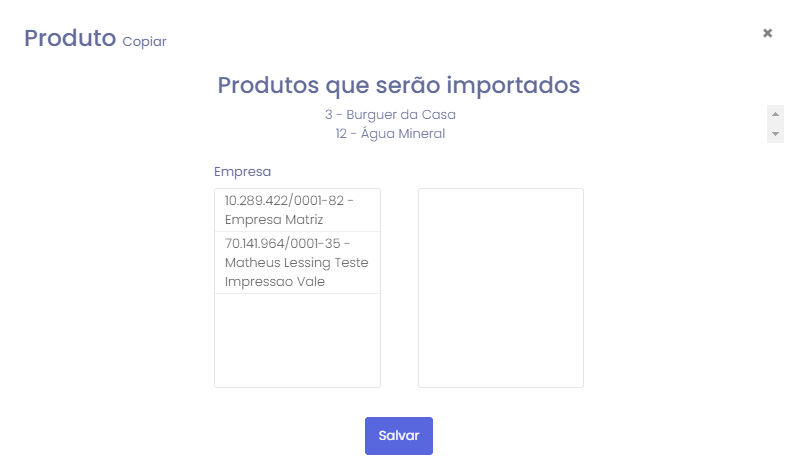 2.2. Será aberta uma tela com a descrição dos produtos que serão copiados, como mostra a imagem. Abaixo deles, as suas empresas. Selecione a empresa para qual devem ser copiados os produtos. Por fim, clique em Salvar.