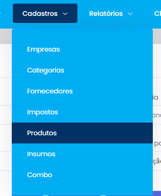 - Acesse sua conta no painel.velocepos.com.br, clique no menu Cadastros e selecione a opção Produtos, como na figura abaixo: