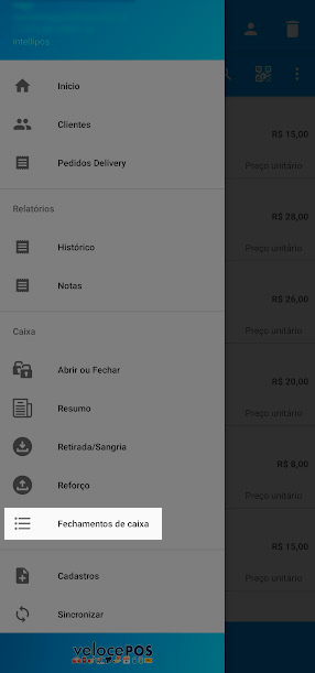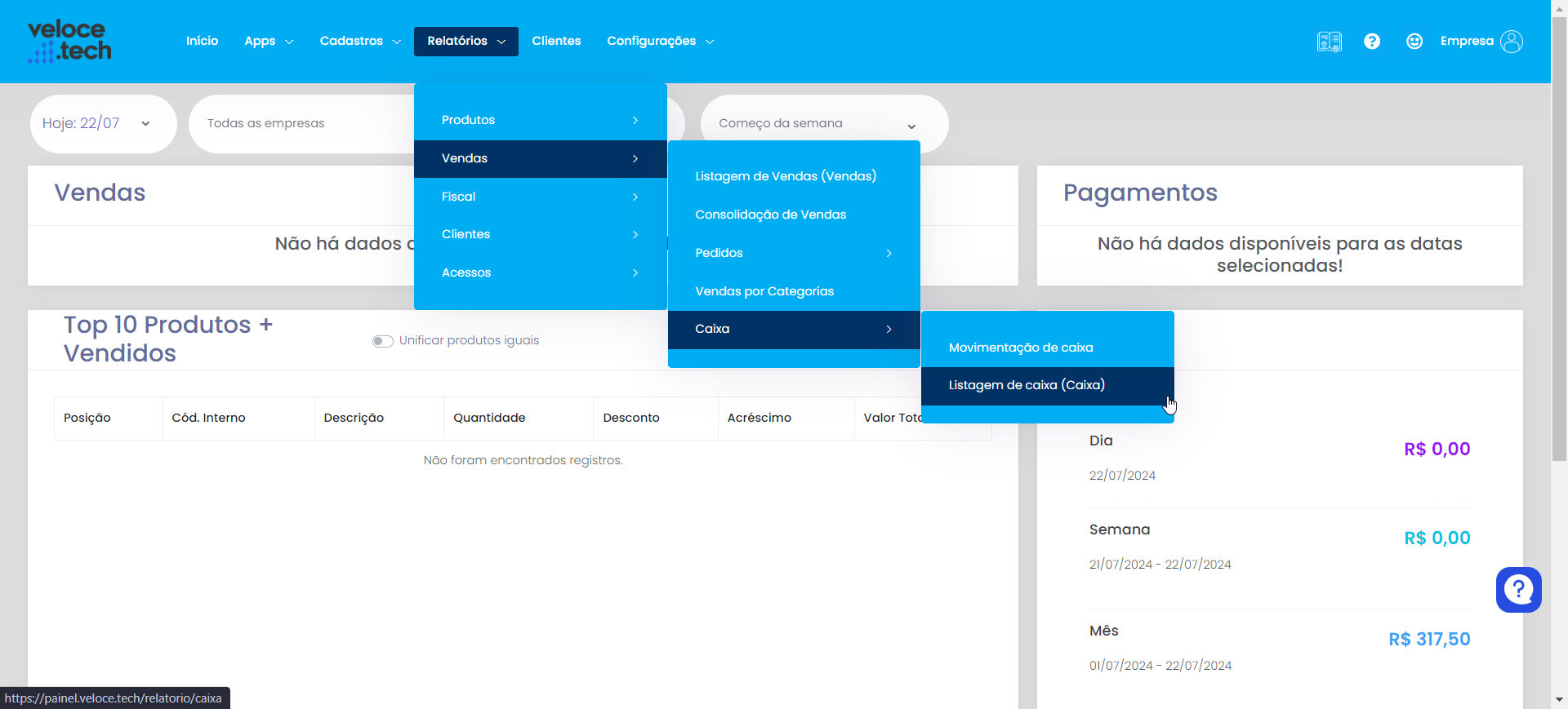 Todas as informações que constam neste relatório estarão acessíveis no seu Painel Web Veloce posteriormente, basta acessar a Listagem de Caixa seguindo o caminho detalhado abaixo.