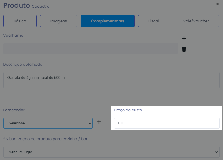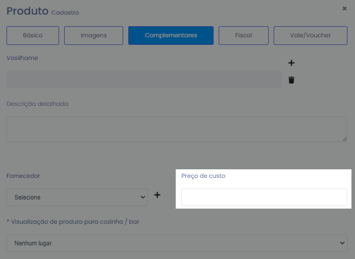Acesse a aba “Complementares” no momento do cadastro para encontrar o campo “Preço de Custo”.