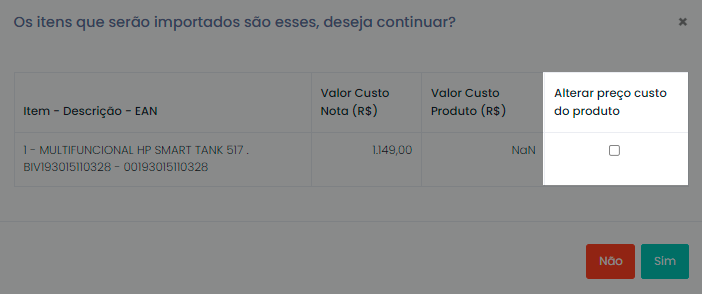 Ao confirmar a importação, a seguinte janela se abrirá, clique na opção “Alterar preço custo do produto”.