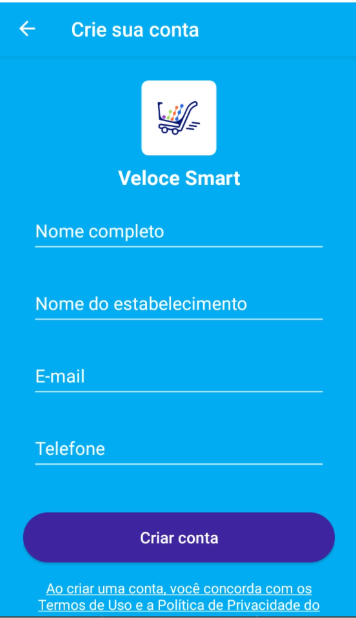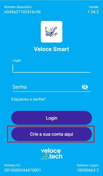 Ao abrir o aplicativo Veloce Smart, localize e clique na opção “Crie a sua conta aqui”. Esse é o primeiro passo para aproveitar todas as funcionalidades da plataforma.