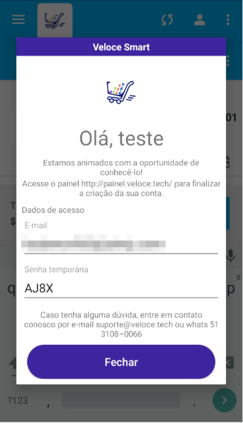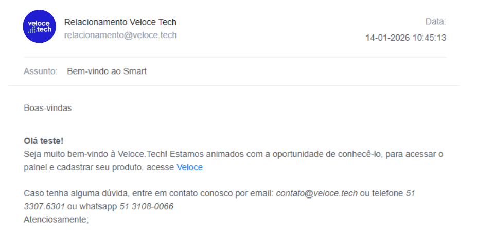 Em seguida, você receberá um e-mail de boas-vindas com um link direto para o Painel Veloce, onde poderá concluir seu cadastro e configurar sua empresa: