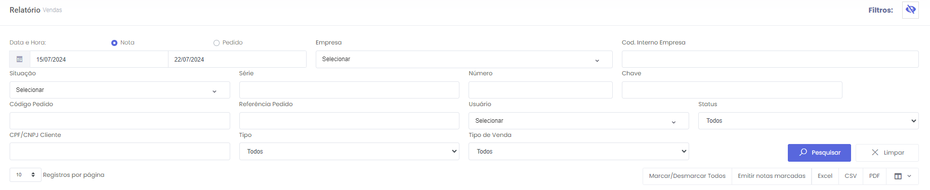 A primeira filtragem que você deve realizar é entre “Nota ou pedido”, localizados no topo dos filtros.